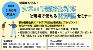 【従業員を守る!カスハラ義務化対応と現場で使える交渉術セミナー】 <開催会場> 日程 1月28日(水)14:00~15:00 会場 秋田県秋田市卸町1丁目3-2 秋ト協ビル3階 <Zoom開催> 日程 2月5日(木)14:00~15:00 ※お申込みいただ…
