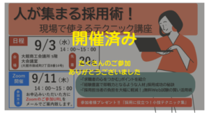 セミナー【優秀な事務員採用テクニック】 <会場開催> 日程 9月3日(水)14:00~15:00 会場 大館商工会議所5階 大会議室(大館市御成町2丁目8番14号) <Zoom開催> 日程 9月11日(木)14:00~15:00 ※お申込みいただいた方にご…