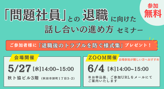 【秋田会場5/27&Zoom開催6/4】「問題社員」との退職に向けた話し合いの進め方セミナー