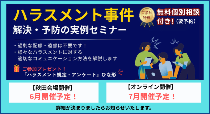 【秋田会場&Zoom開催】「ハラスメント事件 解決・予防の実例セミナー」